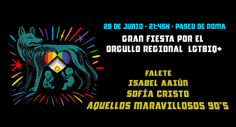 El sábado 28 de junio tras la Manifestación y Lectura de Manifiesto, el Paseo de Roma acogerá la Gran Fiesta del Orgullo LGTBIQ+ Extremadura con las actuaciones de Falete, Isabel Aaiún, Sofia Cristo y Aquellos maravillosos 90’s. Acceso libre