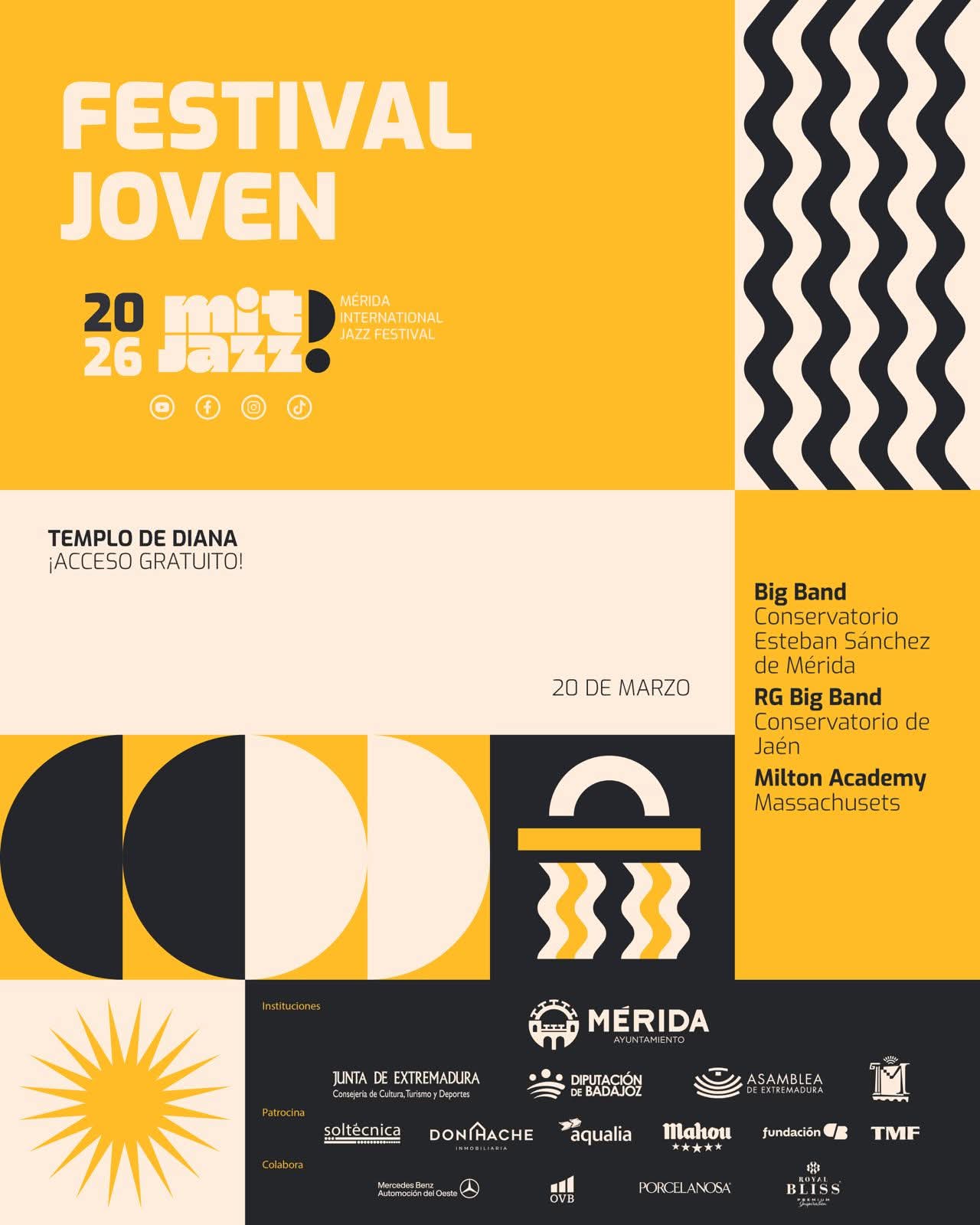 El Festival Joven es un espacio de formación y creación, con un encuentro de big bands nacionales e internacionales, jam sessions y masterclasses para jóvenes talentos. La Big Band del Conservatorio de Mérida, bajo la dirección de Raúl Miguel, fomenta el jazz en la enseñanza clásica; la Big Band de Jaén aporta experiencia desde Andalucía; y Milton Academy representa a Estados Unidos en esta cita, promoviendo el intercambio musical y la vivencia conjunta sobre el escenario.