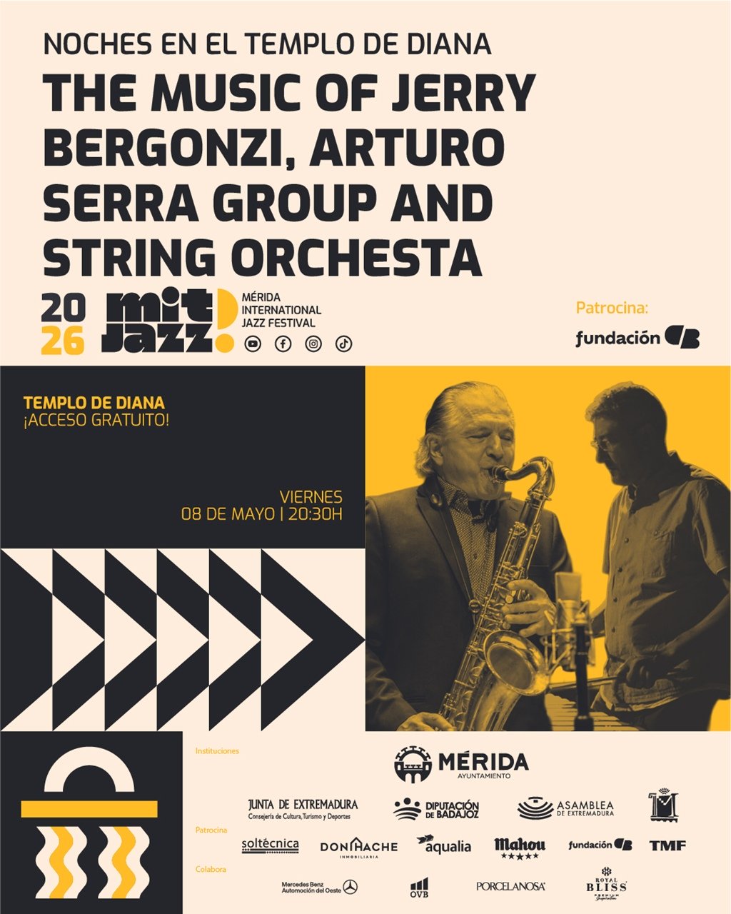 Jerry Bergonzi, uno de los principales pedagogos y saxofonistas de jazz estadounidenses, se presenta junto al vibrafonista Arturo Serra. En este concierto, contarán con una orquesta de cuerdas integrada en el proyecto OSCAM, con arreglos de Serra. Además del espectáculo, ofrecerán una master class para jóvenes músicos extremeños, fomentando el aprendizaje y la conexión intergeneracional. El 8 de mayo, a las 20:30 horas en el Templo de Diana con acceso libre. El concierto forma parte del Mit Jazz Festival.