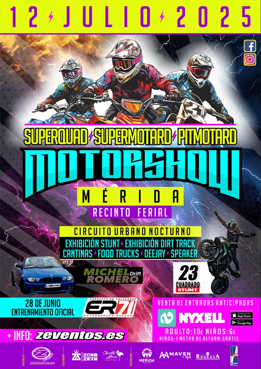 El 12 de julio, el Recinto Ferial acogerá ‘Motorshow Mérida’, la mayor cita del mundo del motor en el sur penínsular con carreras urbanas nocturnas en asfalto, con las variedades de PITMOTARD / SUPERMOTARD y SUPERQUAD. Durante el día serán los entrenamientos con DJS y Speaker. Además, habrá carreras y exhibiciones de STUNT a cargo de CUADRADO STUNT (con grandes acrobacias en variedad de vehículos) y DRIFT con MICHEL ROMERO en su BMW.