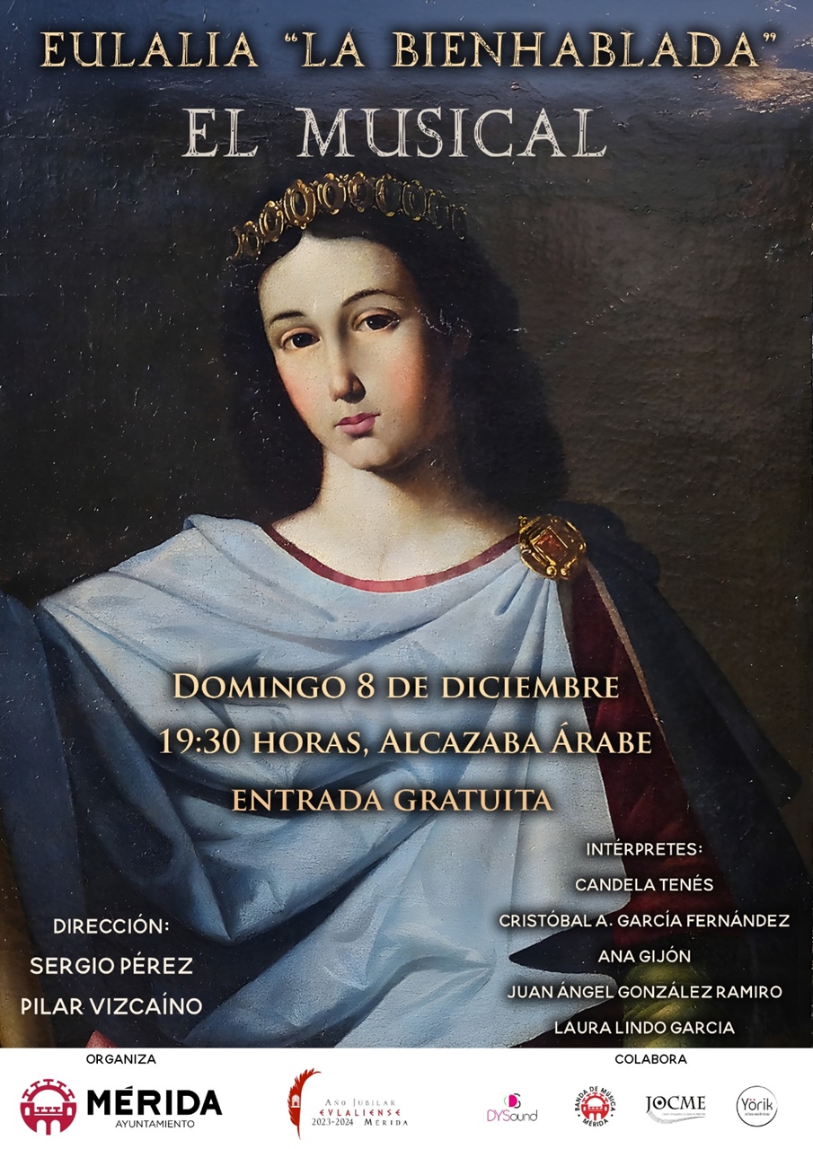 El domingo 8 de diciembre, a las 19,30 horas, se estrenará en la Alcazaba Árabe el musical «EULALIA, LA BIENHABLADA» a cargo de la Banda de Música de Mérida, la Joven Orquesta Ciudad de Mérida y el Coro Caesar, bajo la dirección de Sergio Pérez y Pilar Vizcaíno. Los intérpretes serán Candela Tenés, Ana Gijón, Cristóbal García, Juan Ángel González y Laura Lindo. Un espectáculo que no dejará a nadie indiferente y que recreará musicalmente los últimos días de Eulalia. Entrada gratuita
