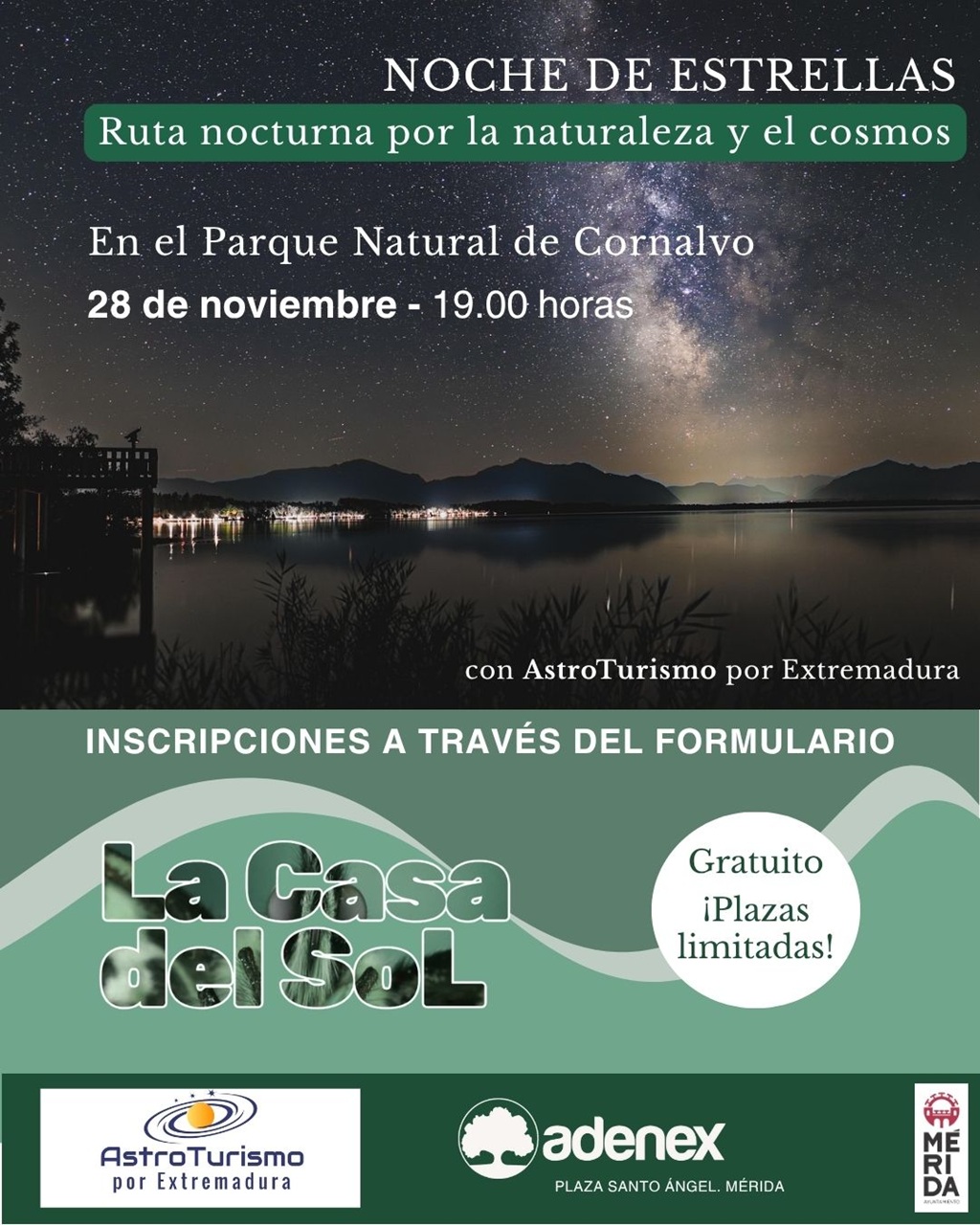 Entre dichas actividades se encuentra la denominada ‘Noche de Estrellas, Ruta nocturna por la naturaleza y el cosmos’ que tendrá lugar el viernes 28 de noviembre, De 19:00 a 21:30 horas, en el Parque Natural de Cornalvo. Una oportunidad única para disfrutar del atardecer en este espacio protegido y dejarse sorprender por un viaje a través del cielo nocturno, descubriendo estrellas, constelaciones y leyendas bajo la guía de personas expertas. ADENEX y Astroturismo por Extremadura invitan a toda la ciudadanía a acercarse, descubrir y participar activamente en estas iniciativas que combinan conocimiento, compromiso ambiental y convivencia.
