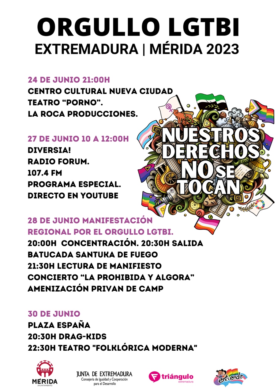 Bajo el Lema “Nuestros derechos no se tocan”, Mérida acogerá diferentes actividades del 24 al 30 de junio dentro de la Semana del Orgullo LGBTI 2023 en la que cobra relevancia la Manifestación Regional del miércoles 28 de junio por los derechos del colectivo.