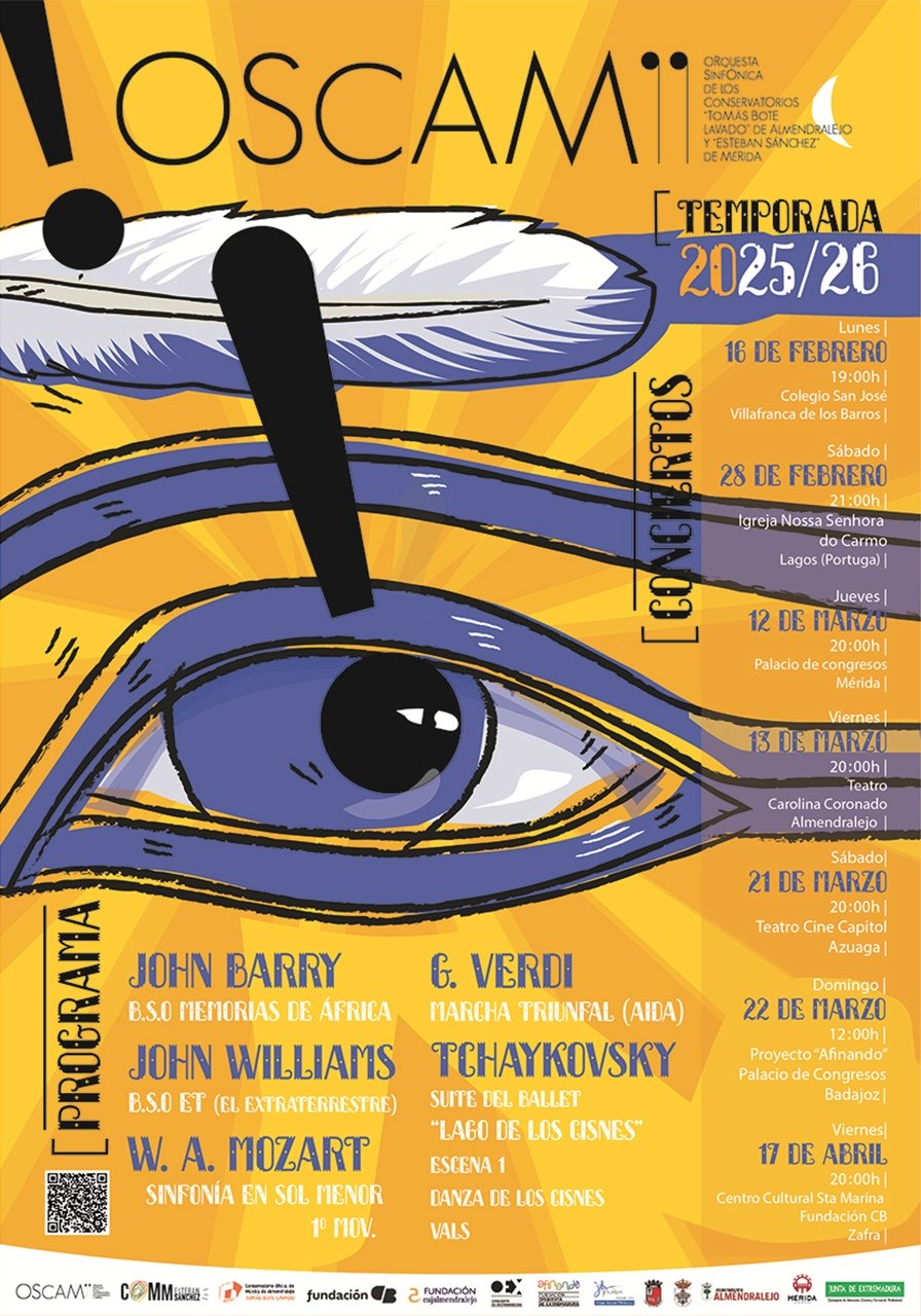 El proyecto educativo OSCAM (Orquesta Sinfónica de los Conservatorios de Almendralejo y Mérida) retoma sus actividades con la temporada de conciertos correspondiente al curso 2025-26 que volverá a pasar por el Palacio de Congresos de Mérida, el próximo jueves 12 de marzo. Entrada libre hasta completar aforo.