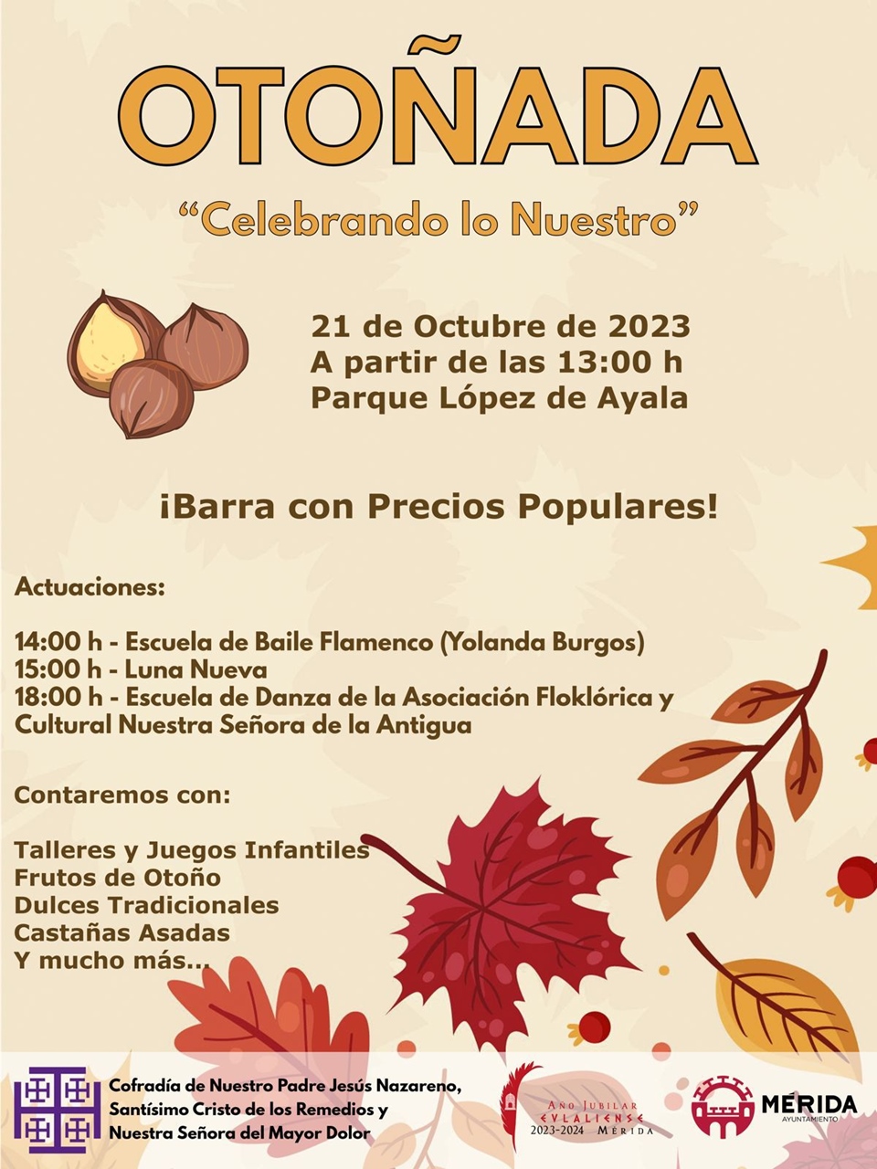 El sábado 21 de octubre la Cofradía de Nuestro Padre Jesús Nazareno, Santísimo Cristo de los Remedios y Nuestra Señora del Mayor Dolor celebrará en el Parque López de Ayala, a partir de las 13,00 h, su primera Otoñada ‘Celebrando lo nuestro’. Próximas al día de Todos los Santos, se quiere poner en valor las reuniones familiares saboreando castañas, nueces e higos, y dulces típicos.