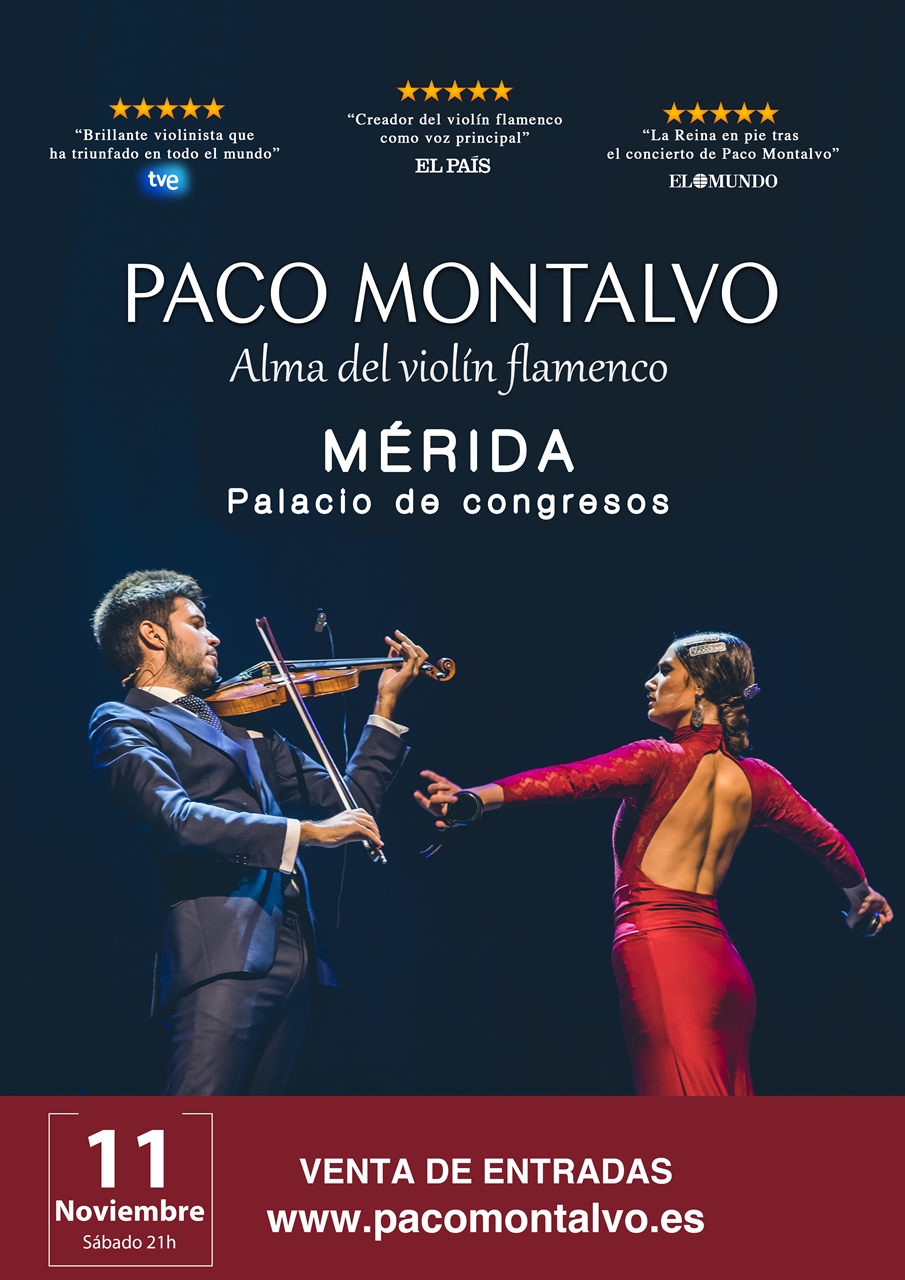 Paco Montalvo actuará en Mérida el viernes 11 de noviembre de 2023 para presentar en directo su espectáculo “Alma del violín flamenco” compuesto por los mejores temas del artista ya conocidos y algunos inéditos. Bulerías, Tangos, Alegrías, Rumbas, Guajiras flamencas y un largo etcétera al son del violín flamenco serán la guinda en una noche malagueña de ensueño con la mejor música del artista. Es el violinista más joven del siglo XXI en debutar en el Carnegie Hall de Nueva York. Creador de un estilo innovador, Paco Montalvo ofrece una visión inédita del comportamiento del violín como voz principal del flamenco.