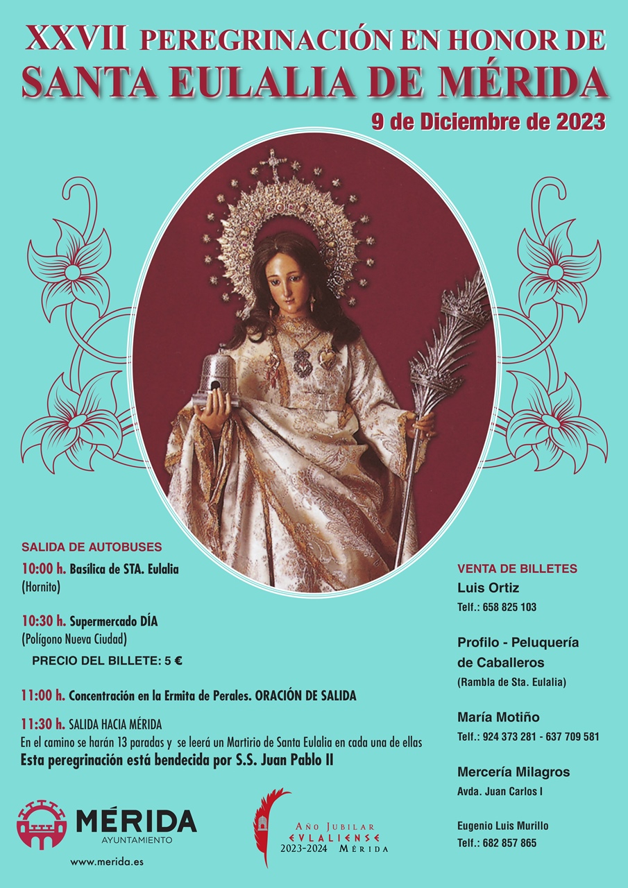 El sábado 9 de diciembre, tendrá lugar la XXVII Peregrinación en Honor a Santa Eulalia de Mérida con salida desde la Ermita de Perales (Arroyo de San Serván) a partir de las 11:30 horas. Durante su recorrido hasta llegar a Mérida se harán 13 paradas y se leerá el Martirio de Santa Eulalia en cada una de ellas. Salida de Autobuses desde Mérida, a las 10:00 horas (Hornito) y 10:30 horas (Supermercado DÍA Nueva Ciudad) con un precio del billete de 5€.