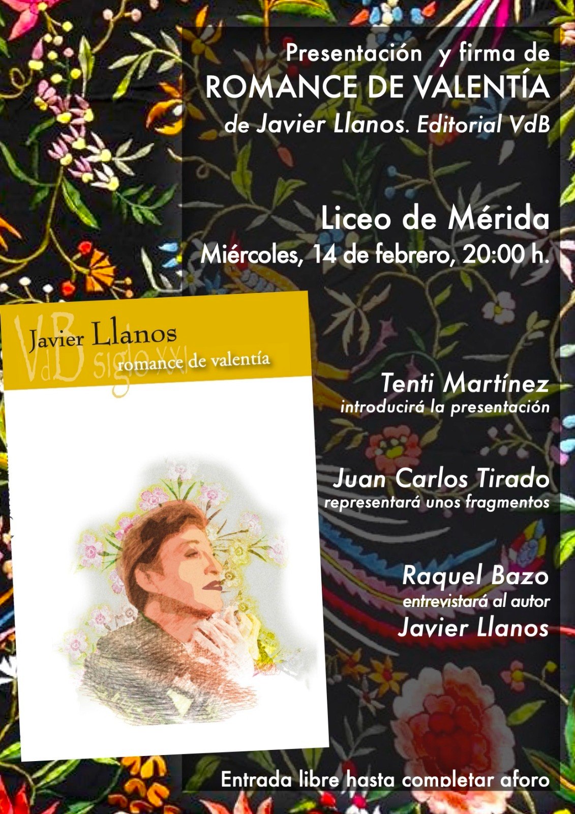 El Liceo de Mérida acoge la presentación del libro ‘Romance de Valentía’ de Javier Llanos el miércoles 14 de febrero, a las 20:00 horas. Juan Carlos Tirado Carroza representará algunos fragmentos de la obra de teatro. Entrada libre.