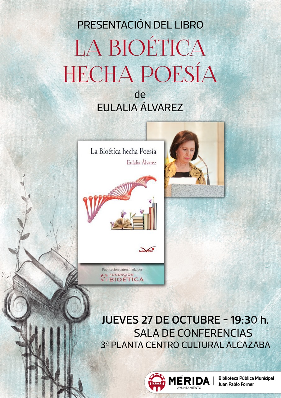 La autora Eulalia Álvarez presentará su nuevo libro ‘La bioética hecha poesía’ el jueves 27 de octubre, a las 19:30 horas, en el Centro Cultural Alcazaba. Organiza la Biblioteca Municipal Juan Pablo Forner de Mérida.