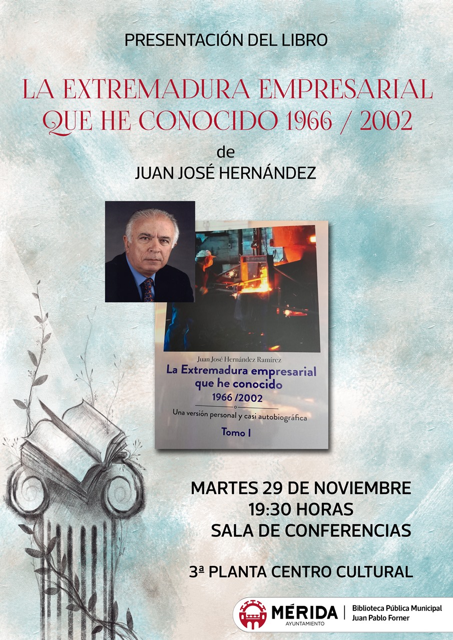 La autora Juan José Hernández presentará su libro ‘La Extremadura Empresarial que he conocido 1966-2002’ el martes 29 de noviembre, a las 19:30 horas, en el Centro Cultural Alcazaba. Organiza la Biblioteca Municipal Juan Pablo Forner de Mérida.