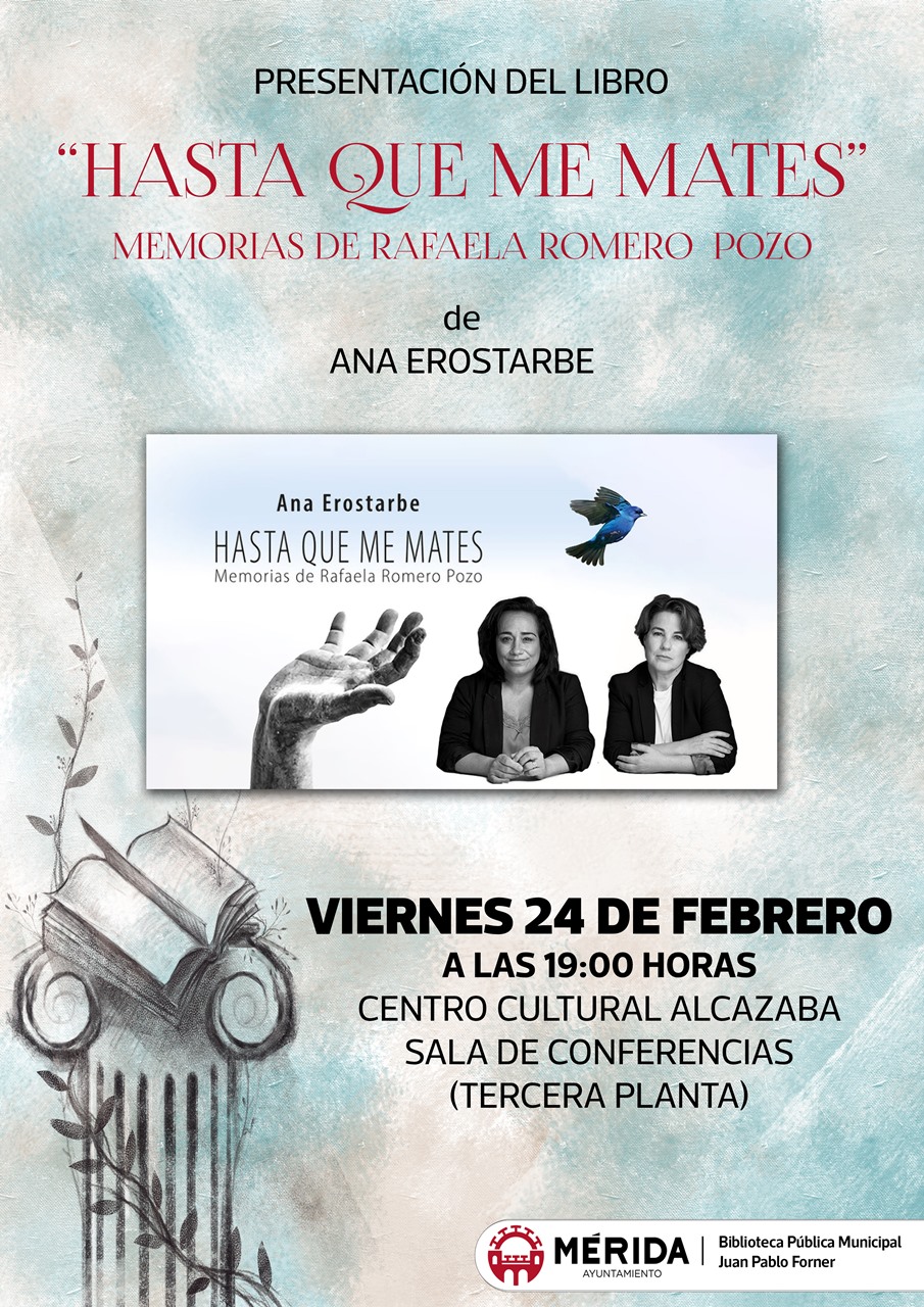 El viernes 24 de febrero, la Biblioteca Juan Pablo Forner acoge la presentación del libro ‘Hasta que me mates’ de Ana Erostarbe. Se trata de las memorias de Rafaela Romero Pozo, política vasca de raíces extremeñas, toda una vida atravesada por la violencia y marcada por el hecho de ser mujer. La periodista Mar Domínguez y la protagonista Rafaela Romero Pozo mantedrán un diálogo abierto.