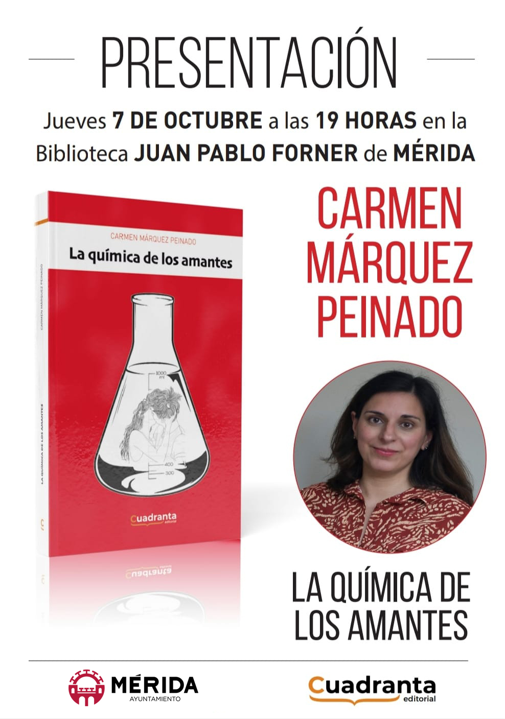 La Biblioteca Municipal Juan Pablo Forner acoge, el jueves 7 de octubre, a las 19:00 horas, la presentación del libro ‘La química de los amantes’ (Editorial Cuadranta) de la autora emeritense Carmen Márquez Peinado.