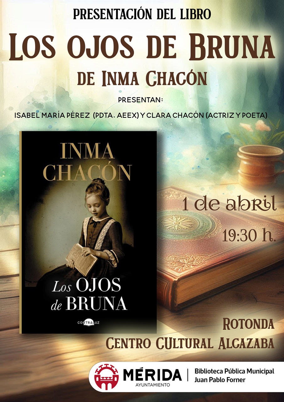 El próximo martes 1 de abril se presenta el último libro de la escritora Inma Chacón llamado «Los ojos de Bruna», que será presentada por Isabel María Pérez (Presidenta de la Asociación de Escritores y Escritoras de Extremadura AEEX) y Clara Chacón (actriz y poeta). En la Rotonda del Centro Cultural Alcazaba, a las 19:30 horas. Organiza la Biblioteca Municipal Juan Pablo Forner.