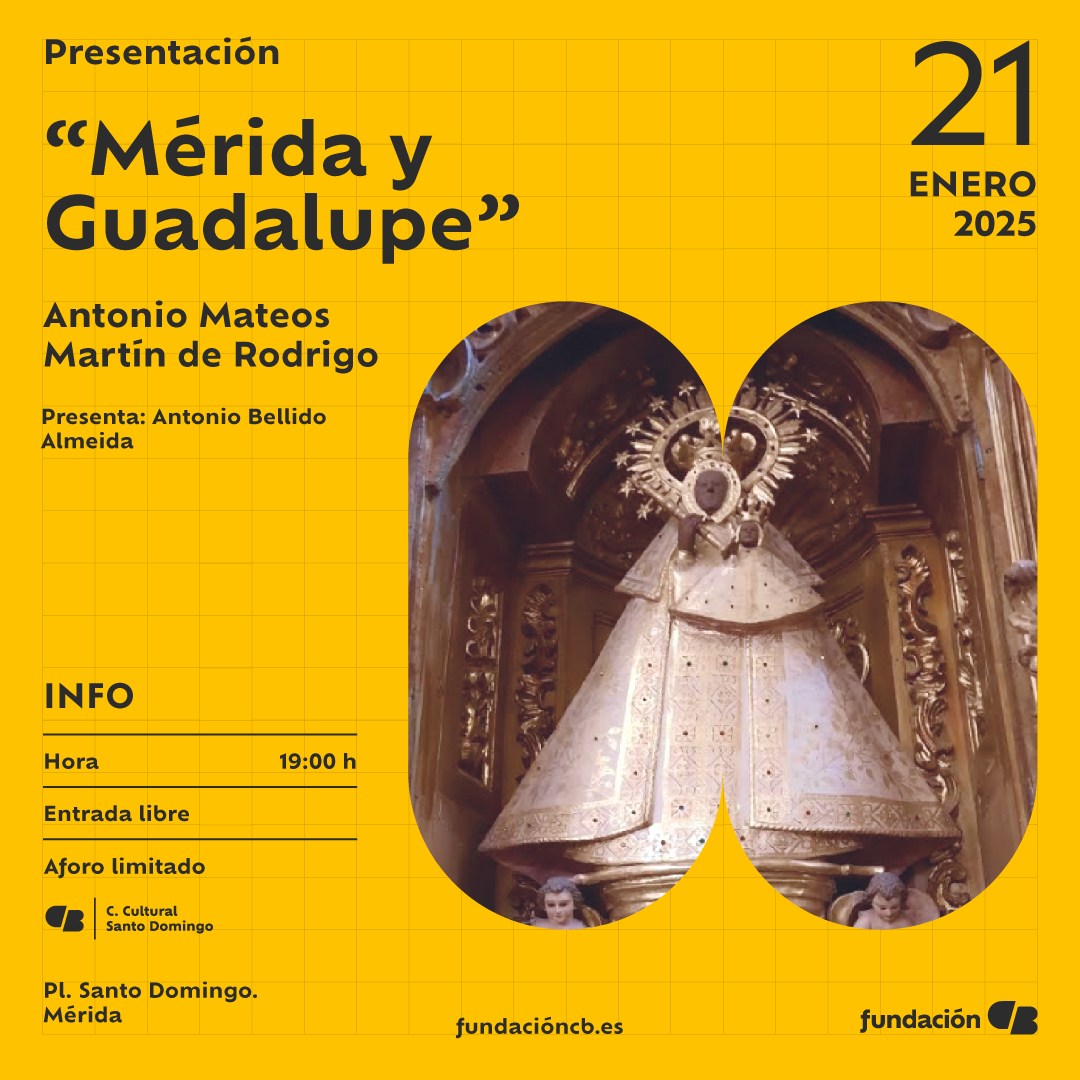 El 21 de enero, a las 19:00 horas, Antonio Mateos Martín de Rodrigo presentará su libro «Mérida y Guadalupe» en el Centro Cultural Santo Domingo en un acto que contará con Antonio Bellido Almeida como presentador. Esta obra recoge la continuidad medieval de Guadalupe como la Emérita mariana y eulaliense taumatúrgica de época romana/visigoda; una nueva descripción de la historia religiosa, política y económica de Extremadura desde dos poblaciones íntimamente relacionadas, incluyendo los hechos que las desvalorizaron junto a Lusitania. Entrada libre