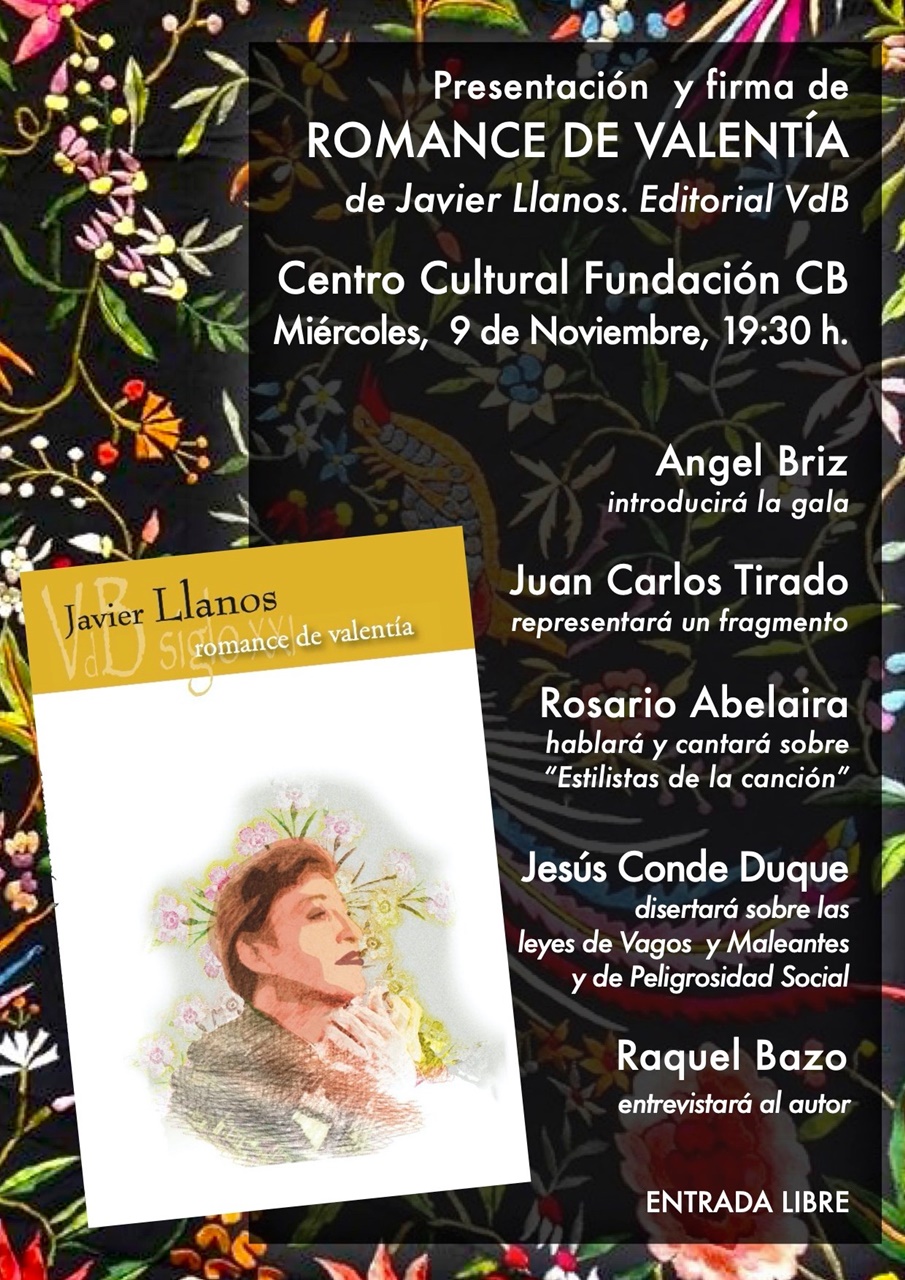 Javier Lanos presentará y firmará ejemplares de su libro ‘Romance de Valentía’ el miércoles 9 de noviembre, a las 19:30 horas, en el Centro Cultural Santo Domingo de la Fundación CB. El acto estará presentado por el periodista Ángel Briz y contará con intervenciones y actuaciones de Juan Carlos Tirado, Rosario Abelaira y Jesús Conde Duque. Raquel Bazo entrevistará al autor. Entrada libre