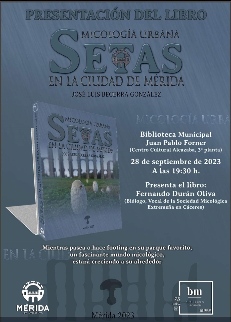 El jueves 28 de septiembre, a las 19:30 horas, el Centro Cultural Alcazaba acoge la presentación del libro ‘Setas en la Ciudad de Mérida’ del emeritense José Luis Becerra González de la Sociedad Micológica de Extremadura que ha realizado un estudio pormenorizado durante muchos años de la micología urbana de Mérida. Organiza la Biblioteca Municipal Juan Pablo Forner.