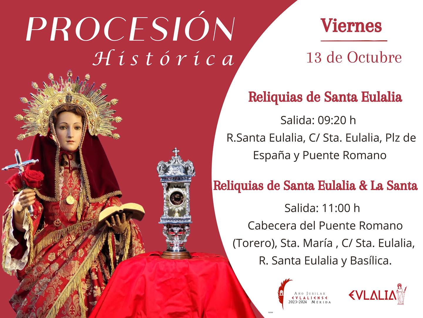 Dentro de las actividades del Camino Eulaliense de Totana-Mérida, el viernes 13 de octubre procesionará, por primera vez, la reliquia de la Mártir que se venera en la Basílica, bajo el templete de plata de Santa Eulalia, y que llegará hasta la cabecera del Puente Romano, en San Antonio, para participar en el encuentro, a las 11:00 horas, con Santa Eulalia de Mérida ‘La Santa’ patrona de Totana procedente de la iglesia de Los Milagros a la que llegará el día anterior.