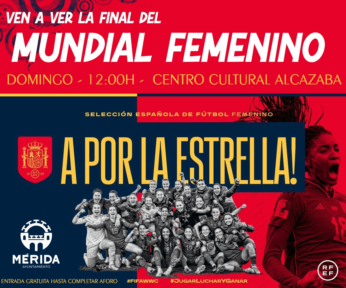 El Ayuntamiento ofrecerá en pantalla grande la Final del Mundial de Fútbol Femenino que enfrentará a la Selección Española 🇪🇸 con la Selección Inglesa, el domingo 20 de agosto a las 12:00 horas. Será en el auditorio del Centro Cultural Alcazaba con entrada libre hasta completar aforo desde las 11:30 horas.