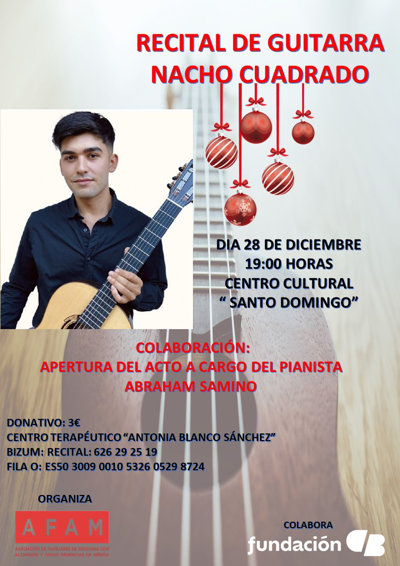 El jueves 28 de diciembre, a las 19:00 horas, el Centro Cultural Santo Domingo acoge un Recital de Guitarra de Nacho Cuadrado a beneficio de AFAM Mérida. Entrada-donativo: 3€