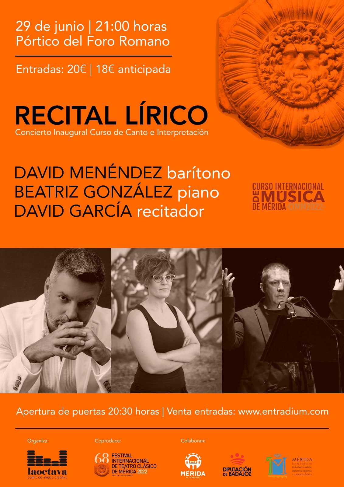 El 29 de junio, a las 21:00 horas, el Pórtico del Foro Romano acoge un Recital Lírico a cargo del barítono David Menéndez, la pianista Beatriz González y el recitador David García. El concierto servirá para inaugurar el curso de Canto e Interpretación que se desarrollará en el Centro de Música Laoctava, del 29 de junio al 3 de julio de 2022. Coproduce el Festival Internacional de Teatro Clásico de Mérida.