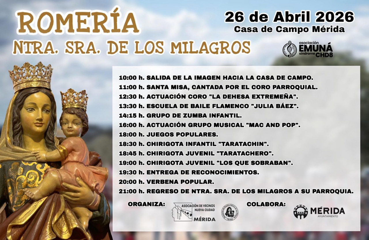 La Asociación de Vecinos de Nueva Ciudad organiza su romería a Ntra. Sra. de los Milagros, patrona de Nueva Ciudad, el próximo domingo 26 de abril, en la casa de campo de Mérida.