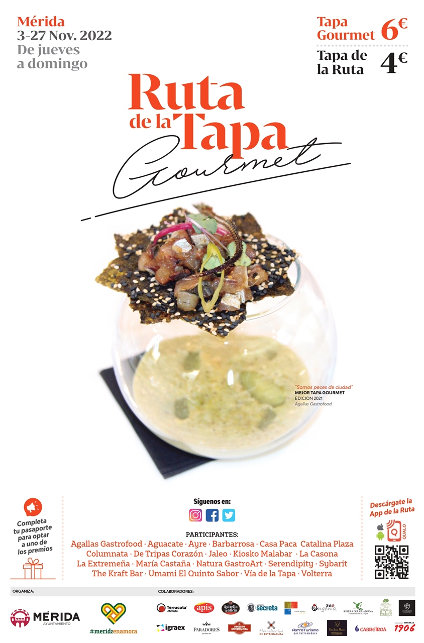 Del 3 al 27 de noviembre de 2022 (de jueves a domingo) se desarrollará una nueva edición de la Ruta de la Tapa Gourmet de Mérida en la que participarán 20 establecimientos de diferentes puntos de la ciudad.