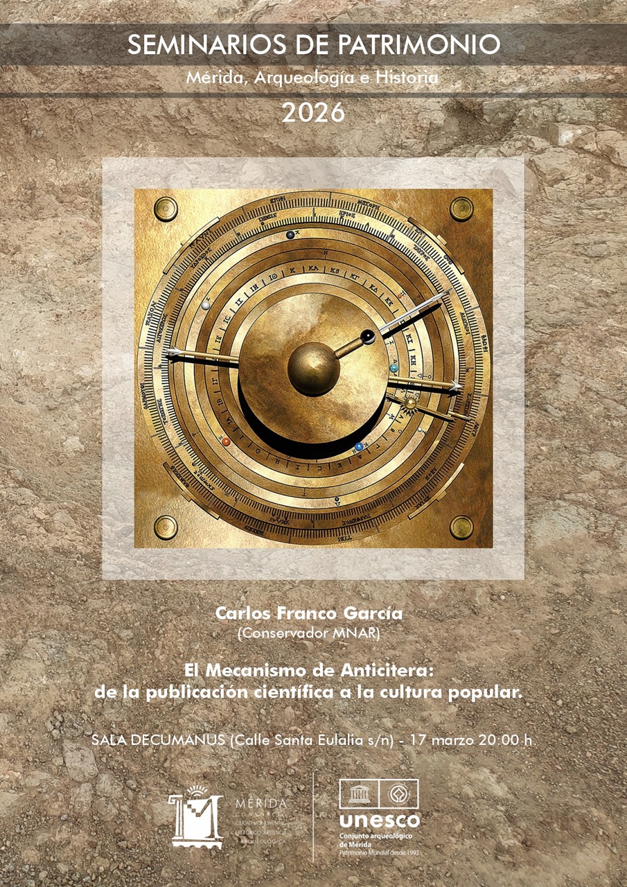 El martes 17 de marzo tendrá lugar un nuevo Seminario de Patrimonio, organizado por el Consorcio de la Ciudad Monumental, donde el conservador Carlos Franco García presentará “El Mecanismo de Anticitera: de la publicación científica a la cultura popular” en el que hablará de uno de los objetos arqueológicos que causan gran fascinación dentro y fuera del mundo académico. En la Sala Decvmanvs, a partir de las 20:00 h.