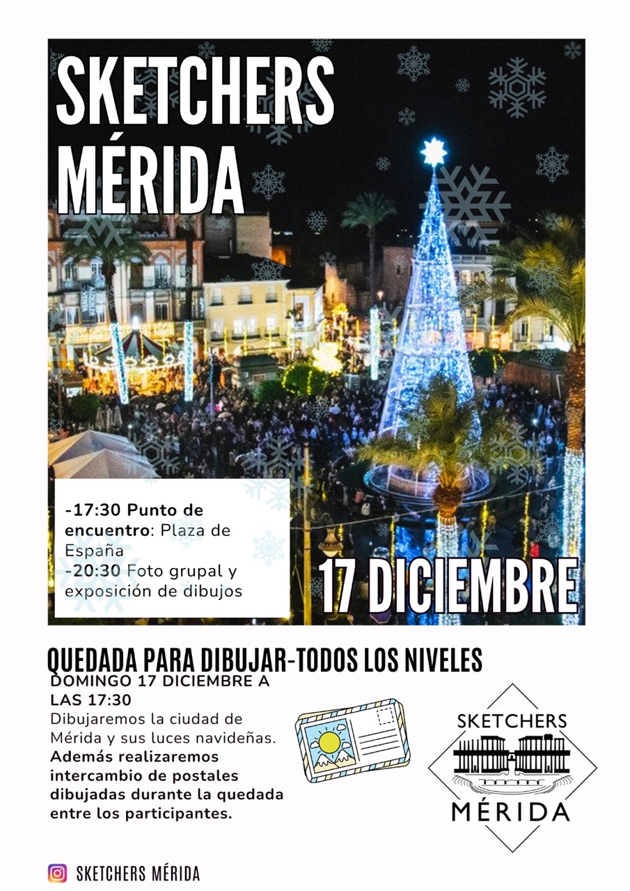 Sketchers Mérida organiza una nueva quedada que está ocasión será en la Plaza de España para dibujar el ambiente y las luces navideñas de Mérida el domingo 17 de diciembre, a las 17:30 horas. Una nueva cita para para los amantes del dibujo apta para dibujantes de cualquier nivel.