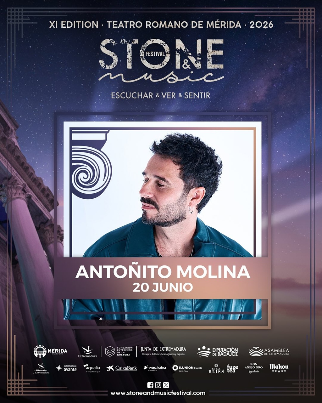 Antoñito Molita se suma al cartel de la próxima edición del STONE&MUSIC, donde actuará el 20 de junio. No será la primera vez que cante en el marco del festival, aunque sí su debut en solitario en el Teatro Romano: en 2023 fue uno de los artistas invitados en el concierto de Pastora Soler y amigos. El cantante gaditano, además, tiene una fuerte vinculación con Mérida, una ciudad que le ha acogido desde sus primeros pasos en la música y donde tuvo el honor de ser el pregonero del Carnaval Romano el año pasado.