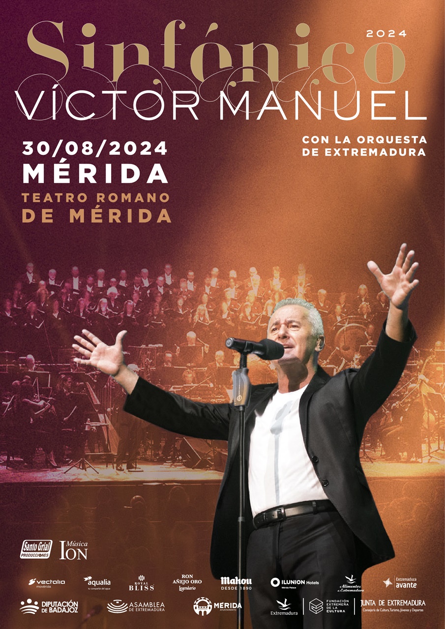 Víctor Manuel actuará por primera vez en el STONE&MUSIC el 30 de agosto. El artista asturiano recalará en el Teatro Romano acompañado de la Orquesta de Extremadura dentro de una gira sinfónica que de momento solo cuenta con cinco actuaciones programadas.