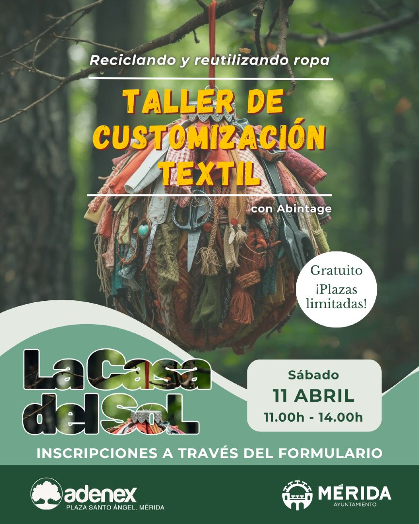El sábado 11 de abril, de 11:00 a 14:00 horas, la Casa del Sol (Sede de Adenex) acoge el Taller de Customización Textil donde se podrá transformar ropa olvidada en diseños únicos, descubriendo las desventajas de la moda rápida y aprendiendo a reutilizar y customizar ropa en esta actividad práctica.