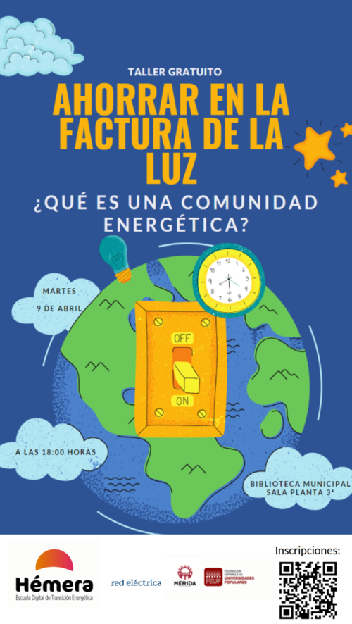 El 9 de abril tendrá lugar el primer taller ‘Ahorrar en la factura de la luz’ del programa formativo Hémera, la Escuela Digital para la Transición Energética promovida por Redeia y la Federación Española de Universidades Populares (FEUP), en la Sala de Conferencias de la tercera planta de la Biblioteca Municipal a las 18 horas.