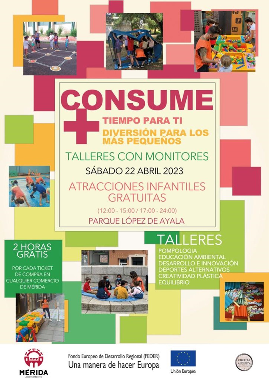 Las actividades de ‘Consume + tiempo para ti’ tendrán lugar el próximo sábado, 22 de abril, en el Parque López de Ayala. Será un jornada lúdica dirigida al público infantil para que los más pequeños puedan disfrutar de los talleres programados mientras que los mayores puedan aprovechar para hacer sus compras en los comercios de proximidad, tomar algo o pasear nuestra ciudad, un aliciente más para Consumir Mérida de manera sostenible e integradora.