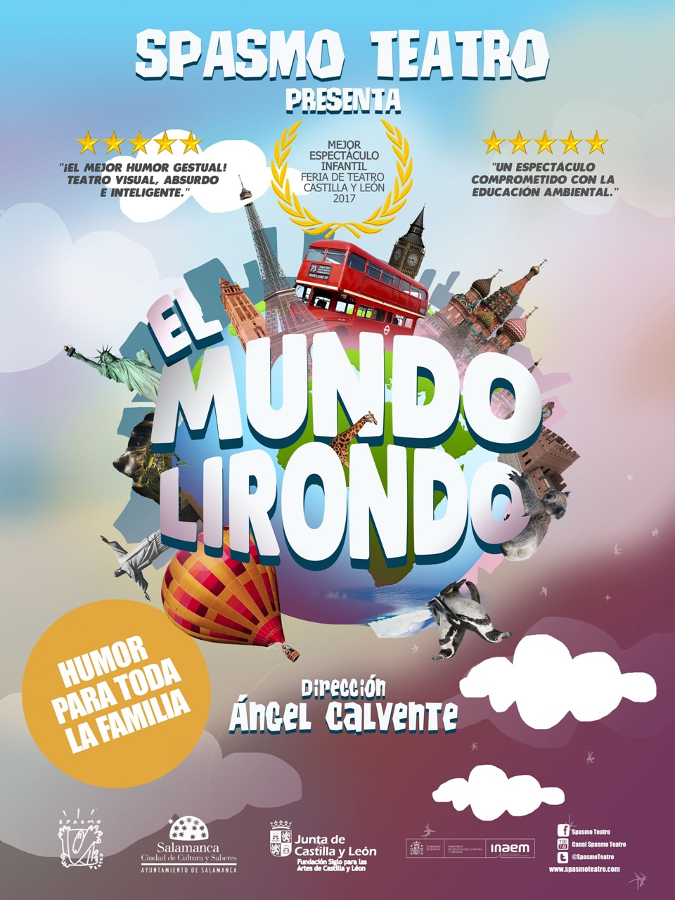 Sinopsis: Spasmo presenta “El Mundo Lirondo”, un viaje que te llevará a los rincones más lejanos del mundo y te traerá de vuelta a casa. Los pequeños espectadores adquirirán de una manera divertida y emocionante nociones básicas de geografía, gentes y diferencias culturales, plantas y animales, y fundamentalmente, la importancia de respetar y cuidar el medio ambiente. Haz las maletas, coge tu pasaporte y tu cámara de fotos y prepárate para la mayor y más divertida aventura de tu vida. Premio “Mejor Espectáculo Infantil” Feria de Teatro de Castilla y León 2017.