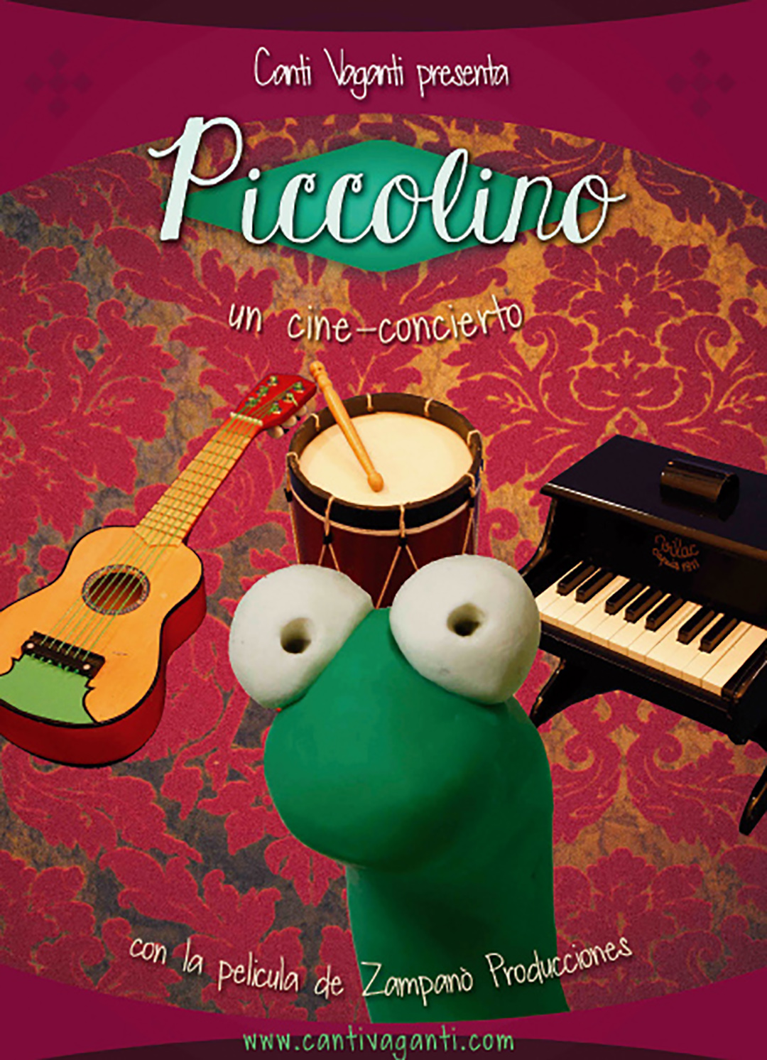 Sinopsis: Piccolino, un cine-concierto es un homenaje a las canciones tradicionales infantiles italianas, españolas e inglesas a través de un cine poético y artesanal. La compañía internacional de teatro musical Canti Vaganti acompaña con música en directo y estímulos sensoriales la proyección de la película Piccolino de Zampanò Producciones, ganadores de un Goya para el mejor cortometraje de animación. Con dos voces, flauta, guitarra, acordeón y percusión, el dúo crea arreglos originales y ritmos variados para esta aventura visual. Además de la música, el protagonista de este espectáculo es la oruga Piccolino, que accidentalmente llega a una casa en el bosque, donde encontrará objetos de todo tipo que le hacen recordar las canciones de sus abuelos.
