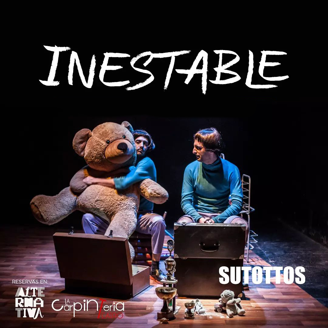 Sinopsis: Este espectáculo del dúo Sutottos toma como eje el miedo y sus derivados; paranoias, fobias, obsesiones y ansiedades. Una puerta mal cerrada o la humedad en una pared son puntos de partida que conducen a la neurosis y que terminan atrapándonos en nuestros propios temores. Ellos, los del escenario, son dos tipos comunes, pero que no pueden ocultar sus fobias. Que son muchas y parecen estar acechándolos en cada rincón mínimo de la vida cotidiana. Ellos la pasan mal. Pero el público estalla de risa. La obra Inestable está marcada por un estilo entre naif y divertido.