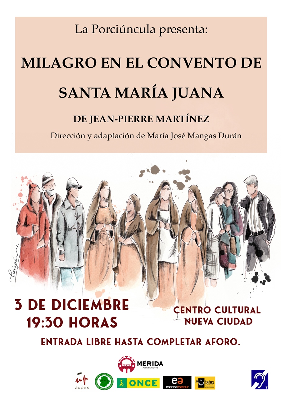 Sinopsis: La obra Milagro en el convento de Santa María-Juana, cuenta la historia de un convento que ha vivido momentos mejores, pero ahora no les va bien, la tienda vende poco, el banco les devuélvelos cheques… y para mayores males muere Sor Ana, que es la monja encargada de fabricar su famoso elixir. A sustituirla llega Sir Inés, una monja dispuesta a renovar el convento y tirar de él. Para ello cambia la fórmula del elixir, añadiendo una nueva hierba que… ¿Qué pasa que después de hacer una cata con el antiguo elixir y este nuevo, todos quieren el nuevo?