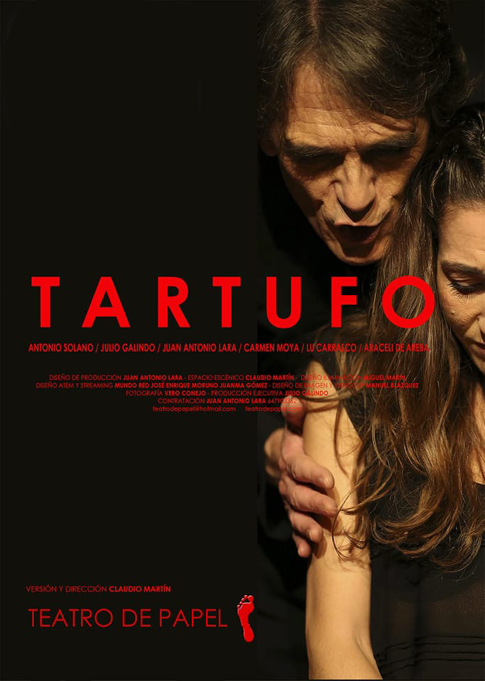 Sinopsis: El gran Moliére , de la mano de la veterana compañía TEATRO DE PAPEL, nos cuenta, en forma de comedia, como el impostor Tartufo, con su falsa beatería, consigue torcer la conciencia del burgués Orgón. Toda la familia de éste le advierte de su ceguera, pero él es incapaz de ver la realidad, y poco a poco va cediendo a las pretensiones de Tartufo. Sólo la pertinaz insistencia