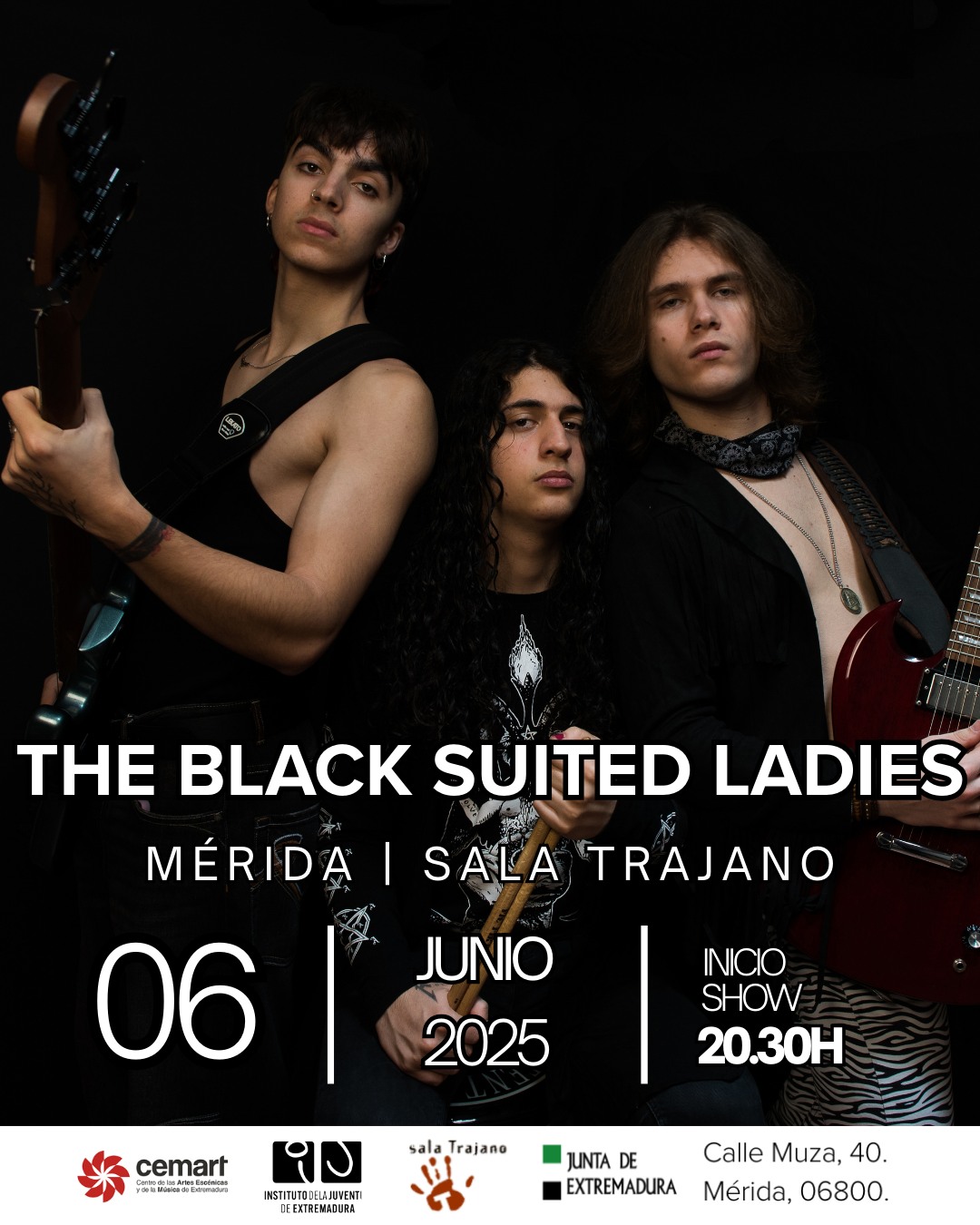 El viernes 6 de junio, a las 20:30 horas, la Sala Trajano acoge el concierto de ‘The Black Suited Ladies’, una joven banda de rock pacense que compone e interpreta temas propios en inglés, a partir de influencias de bandas legendarias como ‘The Beatles’, ‘Queen’, ‘Led Zeppelin’ o ‘Metallica’.