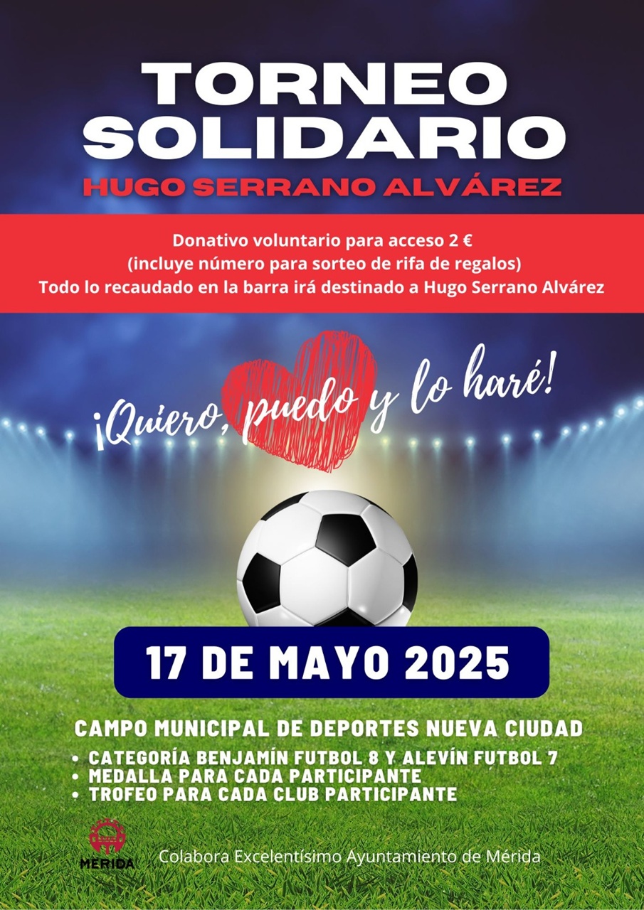 El campo municipal de Nueva Ciudad acoge un Torneo Solidario a favor de Hugo Serrano Álvarez el sábado 17 de mayo con la participación de equipos benjamines y alevines de la ciudad. Entrada-donativo: 2€.