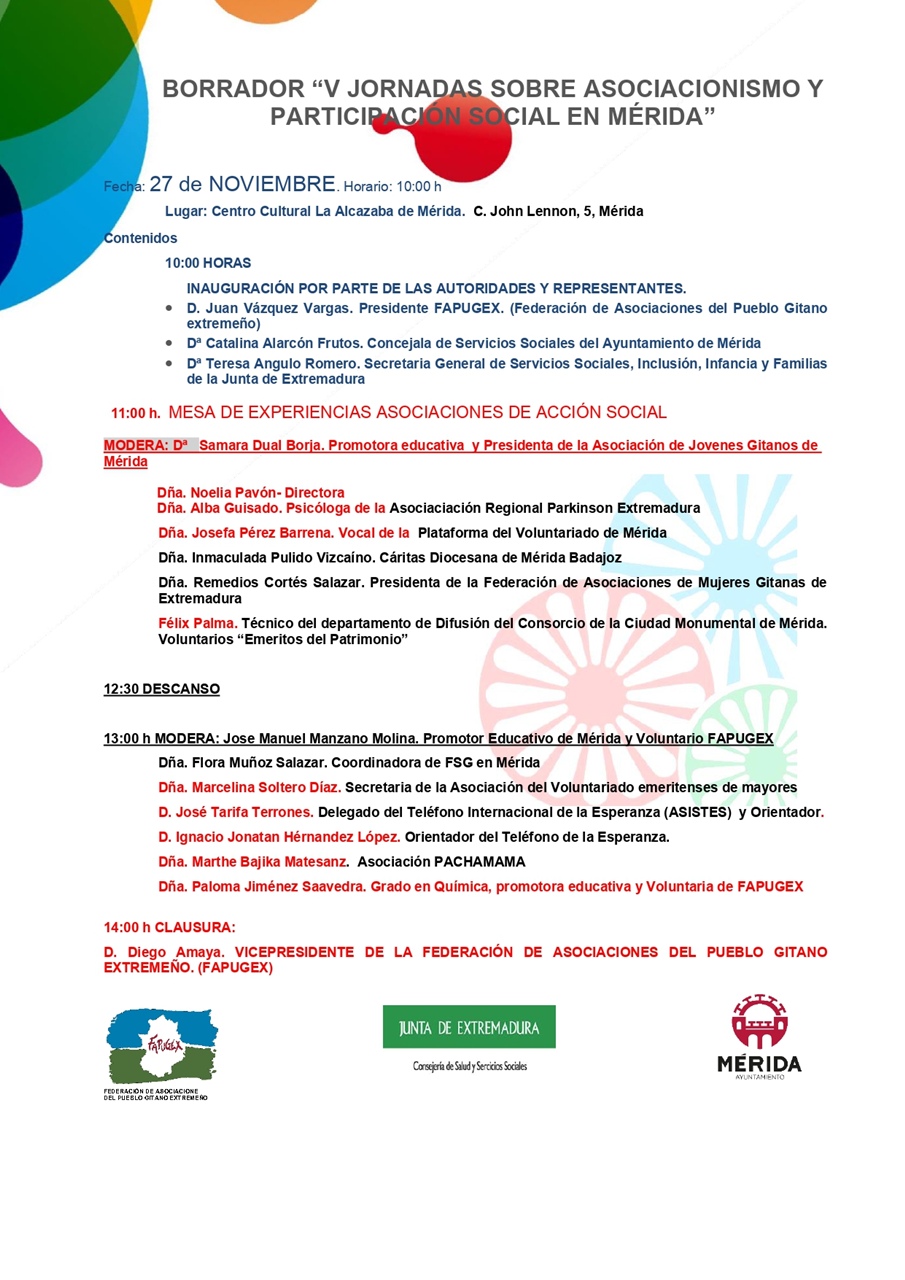 El miércoles 27 de noviembre tendrán lugar, en el Centro Cultural Alcazaba, las «V JORNADAS DE ASOCIACIONISMO Y PARTICIPACIÓN», un espacio para construir un tejido asociativo fuerte y comprometido, fortaleciendo la colaboración entre las asociaciones de Mérida. Abierto a toda la población. Organiza la Federación de Asociaciones del Pueblo Gitano Extremeño FAGUPEX