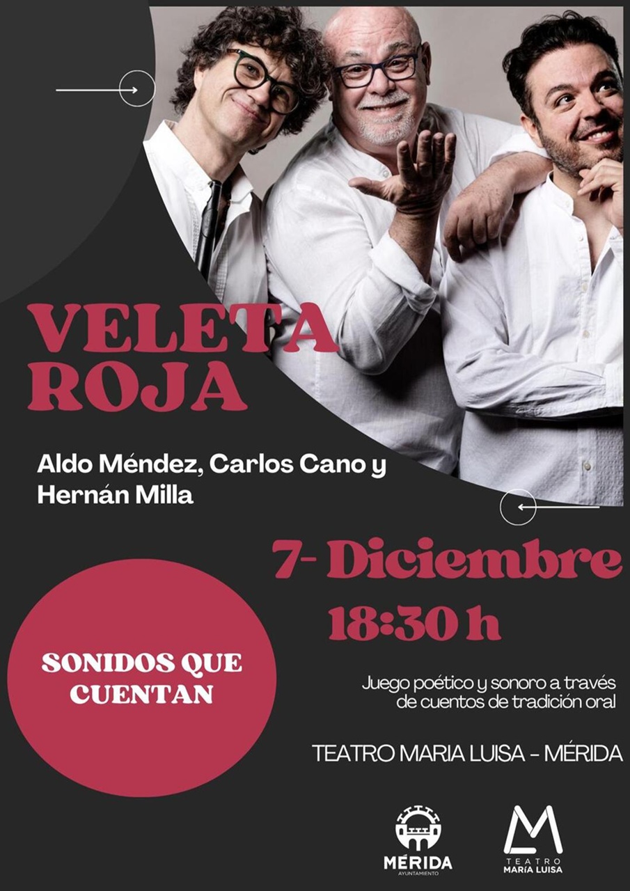 El Teatro María Luisa acoge el domingo, 7 de diciembre, el concierto de ‘Veleta Roja’ en donde la narración oral, música y poesía se integran en un espectáculo para toda la familia que nace y se sostiene en el arte la improvisación. Aldo Méndez, Carlos Cano y Hernán Milla proponen un juego poético y sonoro de 60 minutos en una atmósfera íntima que apela a la necesidad de crear espacios de comunicación afectiva a través del arte y que convierte al público en parte activa del proceso lúdico y creativo.
