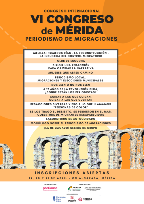 La sexta edición del Congreso Internacional de Periodismo de Migraciones y Desarrollo cambia las fechas habituales y tendrá lugar del 19 al 21 de abril de 2023, en el Centro Cultural Alcazaba, en Mérida. Se trata del único congreso de esta temática que existe en el mundo y contará con periodistas especializados procedentes de Europa, América Latina, Asia y África.