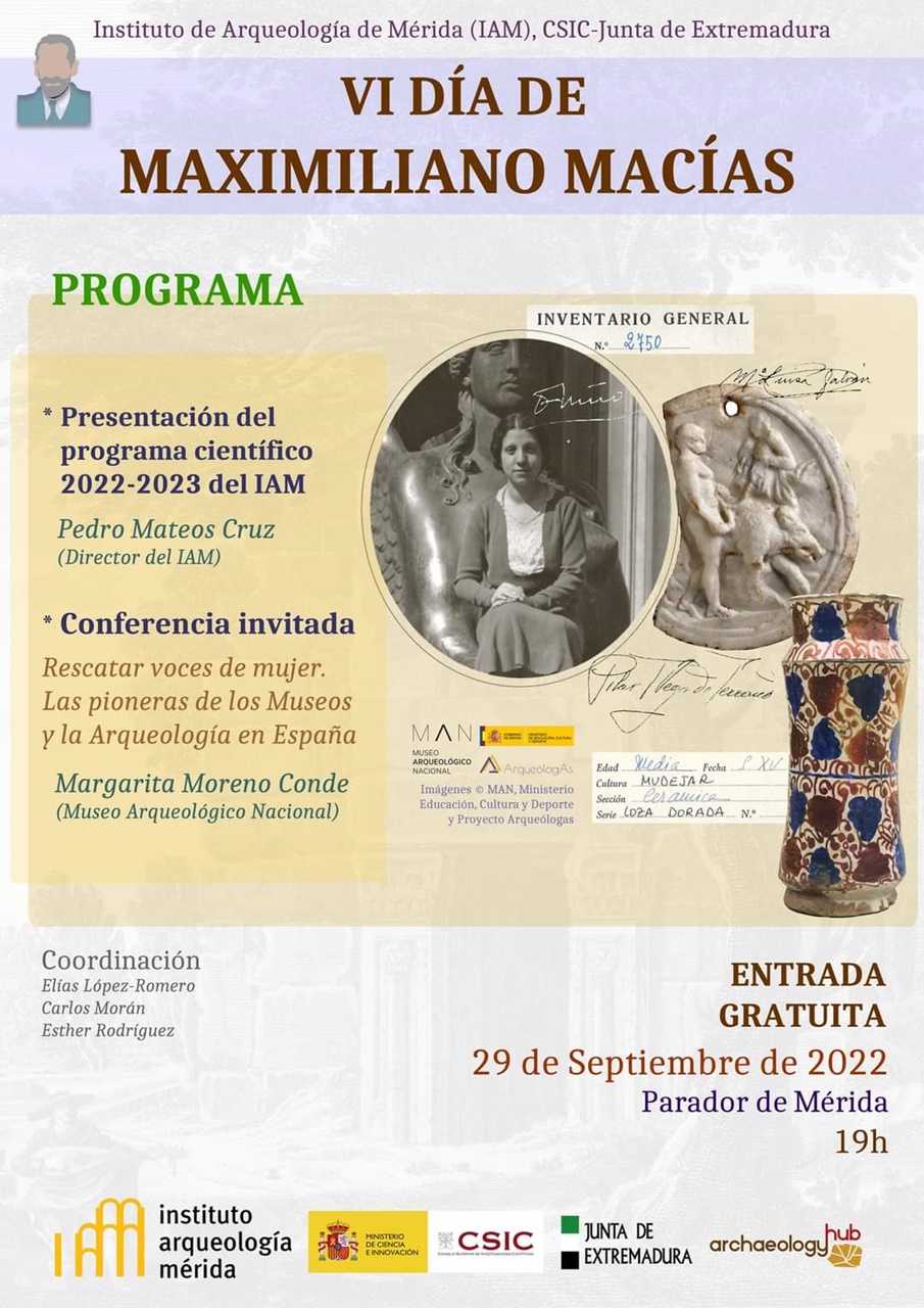 Como cada año, el Instituto de Arqueología de Mérida celebra el DÍA DE MAXIMILIANO MACÍAS, que este año alcanza su VI Edición. La actividad se celebrará finalmente el 29 de septiembre, en el salón AUGUSTO del PARADOR DE MÉRIDA. Se presentará el programa científico 2022-23 a cargo de Pedro Mateos Cruz (director) y tendrá lugar la conferencia ‘Rescatar voces de mujer. Las pioneras de los Museos y la Arqueología en España’ impartida por Margarita Moreno Conde (Museo Arqueológico Nacional)