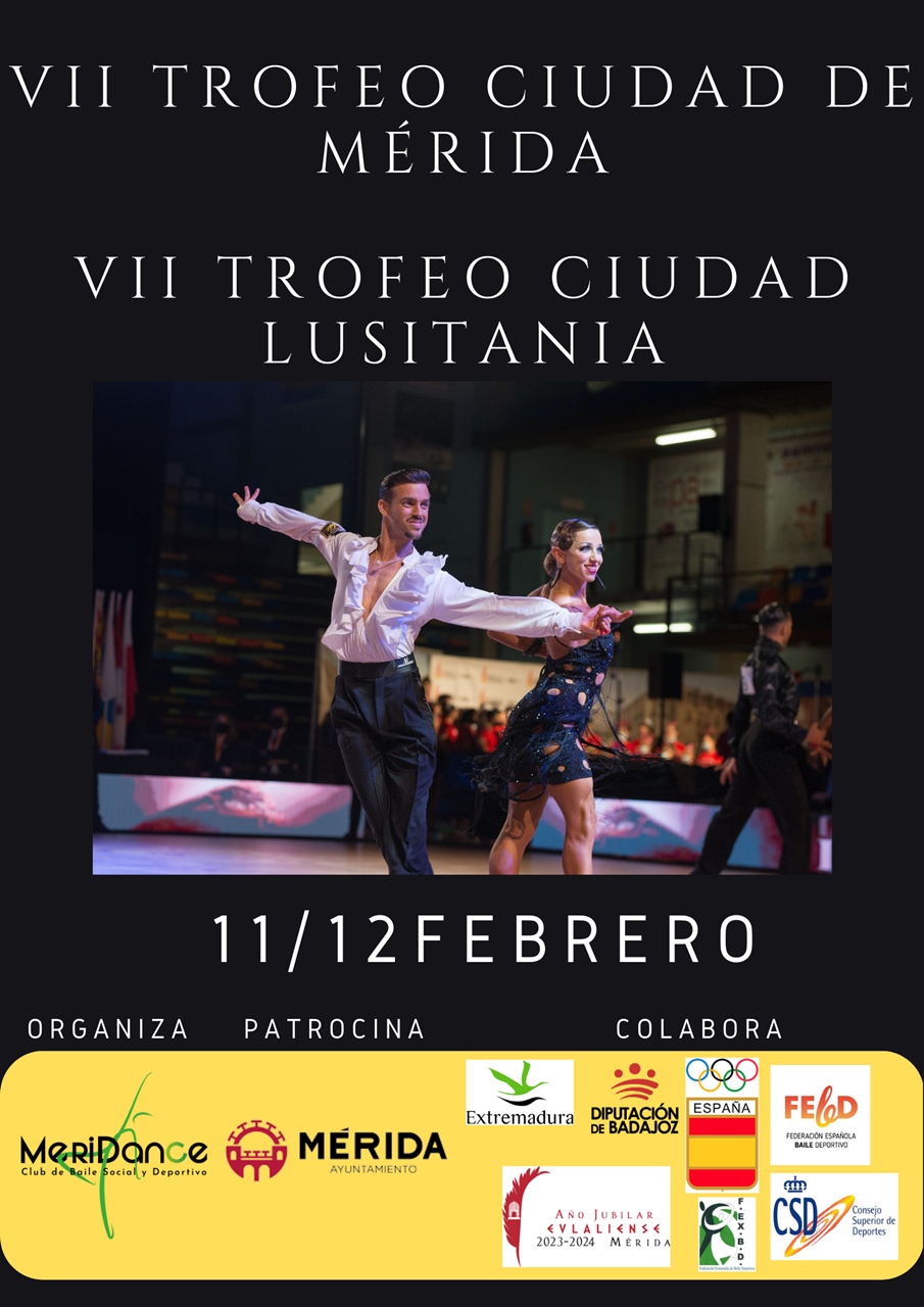 Mérida acogerá la VII edición del Campeonato de Baile Deportivo “Trofeo Ciudad de Mérida” y “Trofeo Lusitania”, los días 11 y 12 de febrero de 202e, en el Polideportivo Guadiana. Organiza el Club de Baile MeriDance con la colaboración de la Federación Extremeña de Baile Deportivo y el Ayuntamiento de Mérida, entre otras entidades.