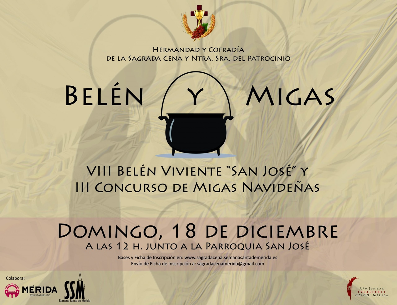 Tras los años de Pandemia, la Hermandad de la Sagrada Cena y Ntra. Sra. del Patrocinio volverá a celebrar su tradicional «Belén Viviente», en este caso, su 8º edición. Así mismo, se celebrará la 3ª edición del Concurso de «Migas Navideñas». Tendrá lugar el domingo, 18 de diciembre junto a la Parroquia de San José.