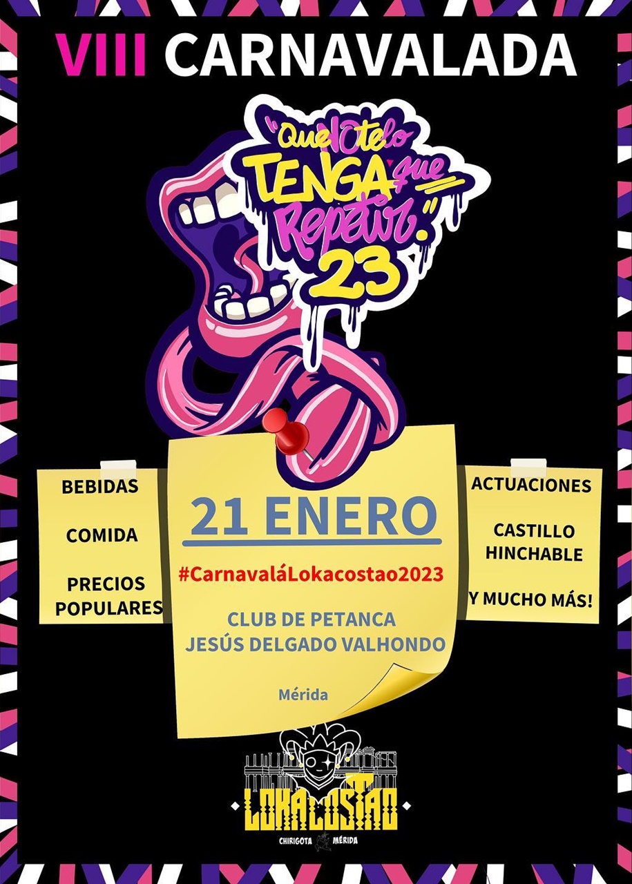 El sábado 21 de enero, a partir de las 13:00 horas, la chirigota Lokacostao organiza la VIII edición de su Carnavalada en el Centro de Petanca ‘Jesús Delgado Valhondo’ de la Zona Sur. Contará con actuaciones, comida y bebida a precios populares, hinchables…