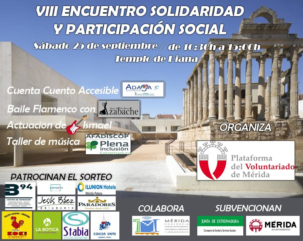 El sábado 25 de septiembre en la plaza del Templo de Diana, tendrá lugar el 8º Encuentro para la Solidaridad y la Participación Social Emeritense, un acto abierto a toda la ciudadanía donde las entidades sociales integradas en la Plataforma mantendrán puntos informativos para mostrar todas sus actividades.
