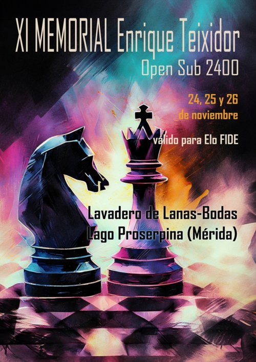 Durante el fin de semana del 24, 25 y 26 de noviembre, tendrá lugar el XI Memorial Enrique Teixidor (Open Sub2400), en el Lavadero de Lanas, con un Torneo Suizo a 7 rondas de partidas clásicas 60+30s, válidas para Elo FIDE. Este año, como novedad, se celebrará la primera edición del concurso de ilustración y micro-relatos «Ajedrez más allá del tablero», orientado a escolares extremeños de educación secundaria y bachillerato de toda Extremadura.