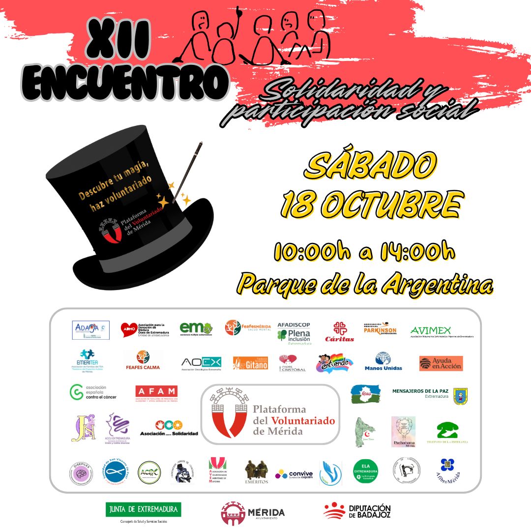 El sábado 18 de octubre, de 10:00h a 14:00 horas, el Parque de la Argentina acoge la XXII Encuentro para la Solidaridad y Participación Social con la presencia de numerosas entidades de la Plataforma del Voluntariado de Mérida con el objetivo de consolidar el tejido asociativo en la localidad y crear espacio para el intercambio de información, experiencias y trabajo conjunto. Habrá numerosas actividades y talleres durante toda la mañana.